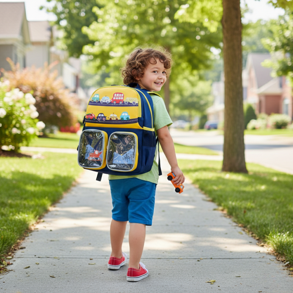 Make school time fun and organized with this Kids Car Print School Backpack, designed especially for preschool and primary school children. Featuring a colorful vehicle theme with cars and bus prints, this backpack is attractive, practical, and comfortable for daily use.