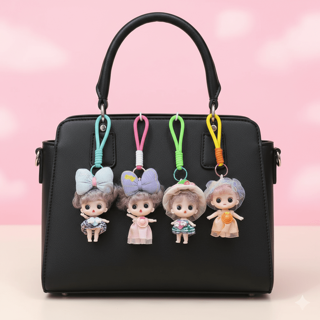 Each doll features fine detailing, soft pastel colors, and a flexible loop strap for easy attachment to backpacks, handbags, school bags, pencil pouches, or keys. Lightweight and attractive, these mini doll bag charms are highly popular for birthday return gifts, party favors, and kids gifting.