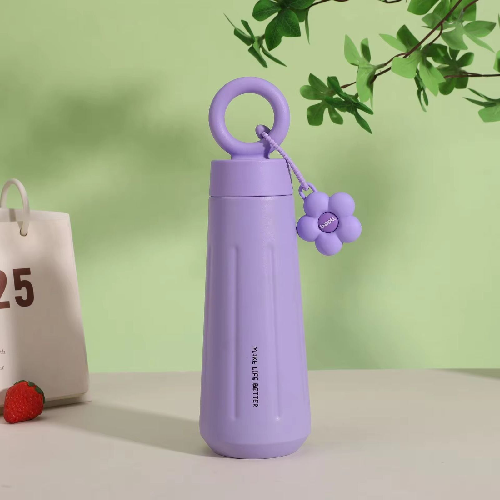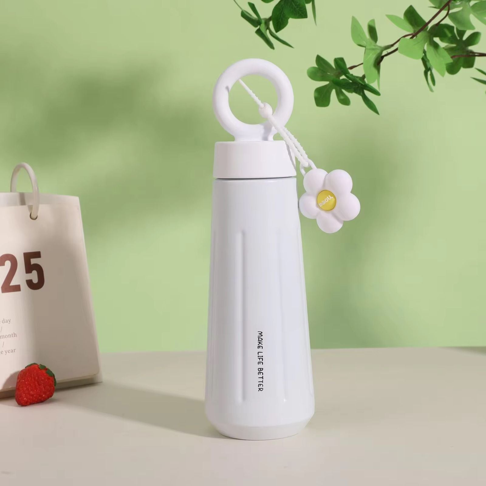 The bottle features a secure, leakproof lid and a sturdy ring handle for easy carrying. A cute detachable charm adds a stylish touch, making it both functional and aesthetically appealing.
