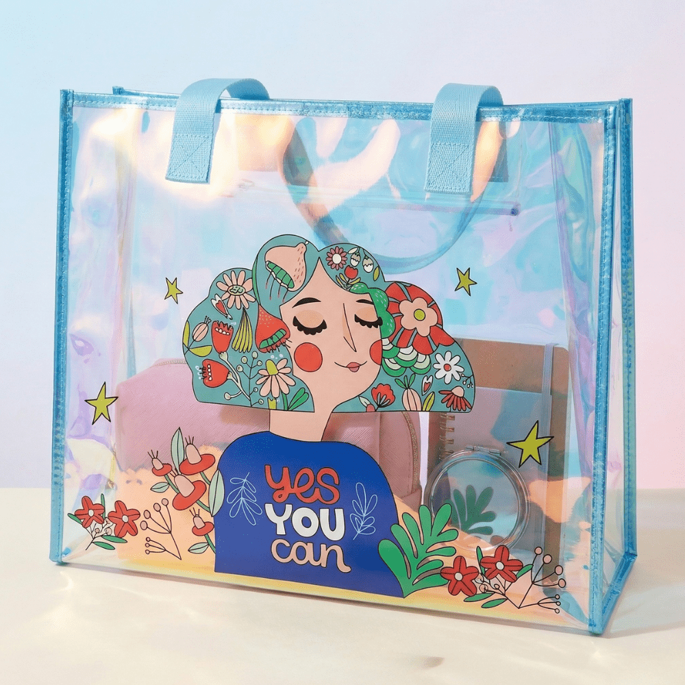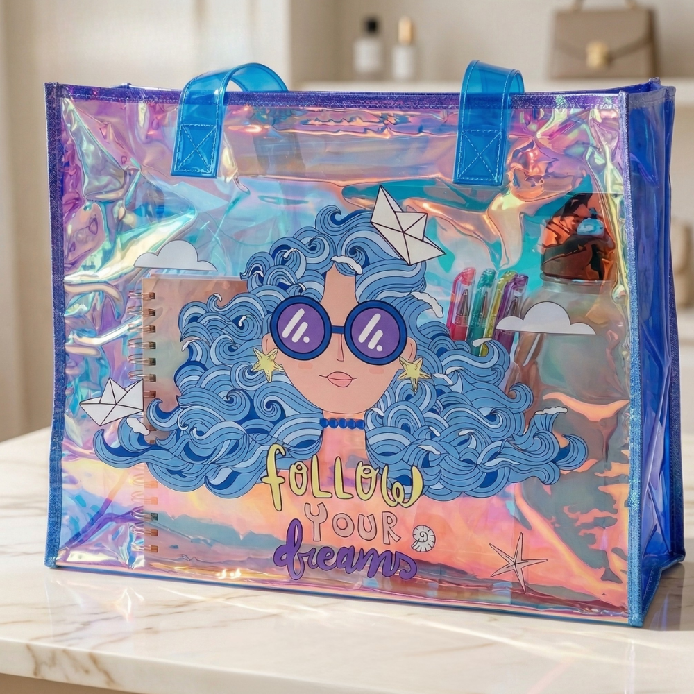 Make everyday carrying fun and stylish with this Transparent Holographic Kids Tote Bag, designed with adorable cartoon prints and a shiny iridescent finish that kids love. Perfect for school, outings, and organizing essentials, this bag combines cute design with practical storage.
