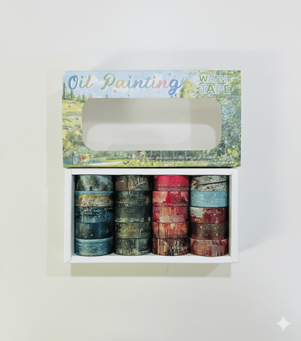 Washi Tape Oil Painting Green Series – Add a touch of artistic elegance to your projects with this premium oil painting-themed decorative masking tape set. Perfect for scrapbooking, journaling, planner decoration, DIY crafts, and gift wrapping, this 20-roll washi tape box combines vibrant colors with sophisticated design details.