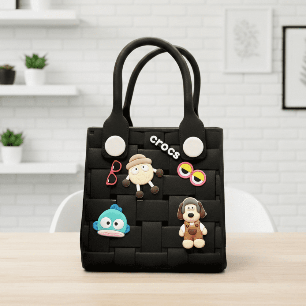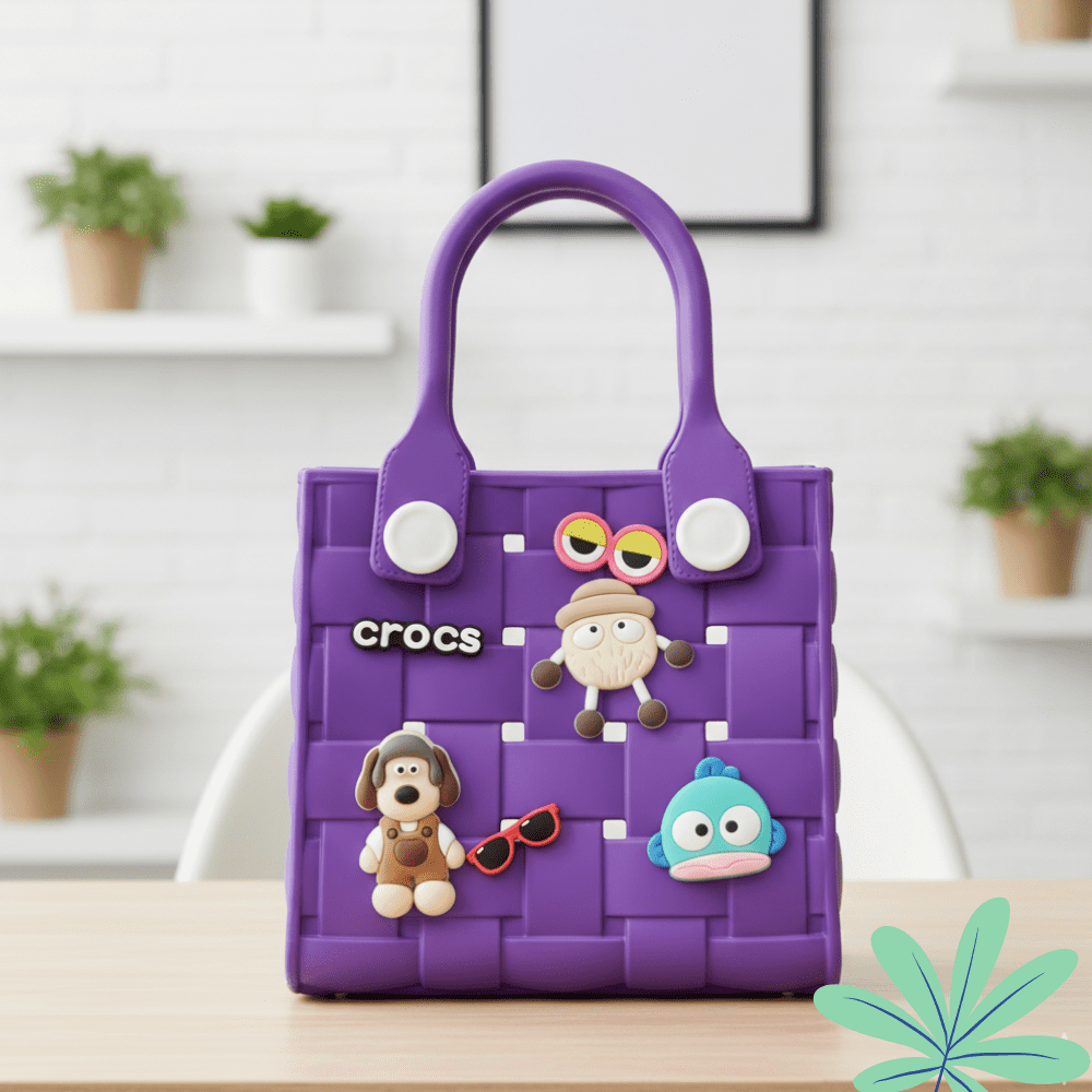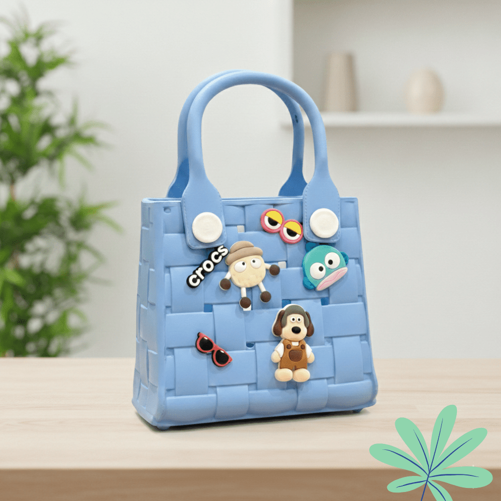 Add a stylish and playful touch to your child’s outfit with this kids woven rubber tote bag featuring cute cartoon charm decorations. Designed with a trendy basket-weave texture and sturdy handles, this mini handbag is perfect for daily outings, school activities, shopping, beach trips, and travel.